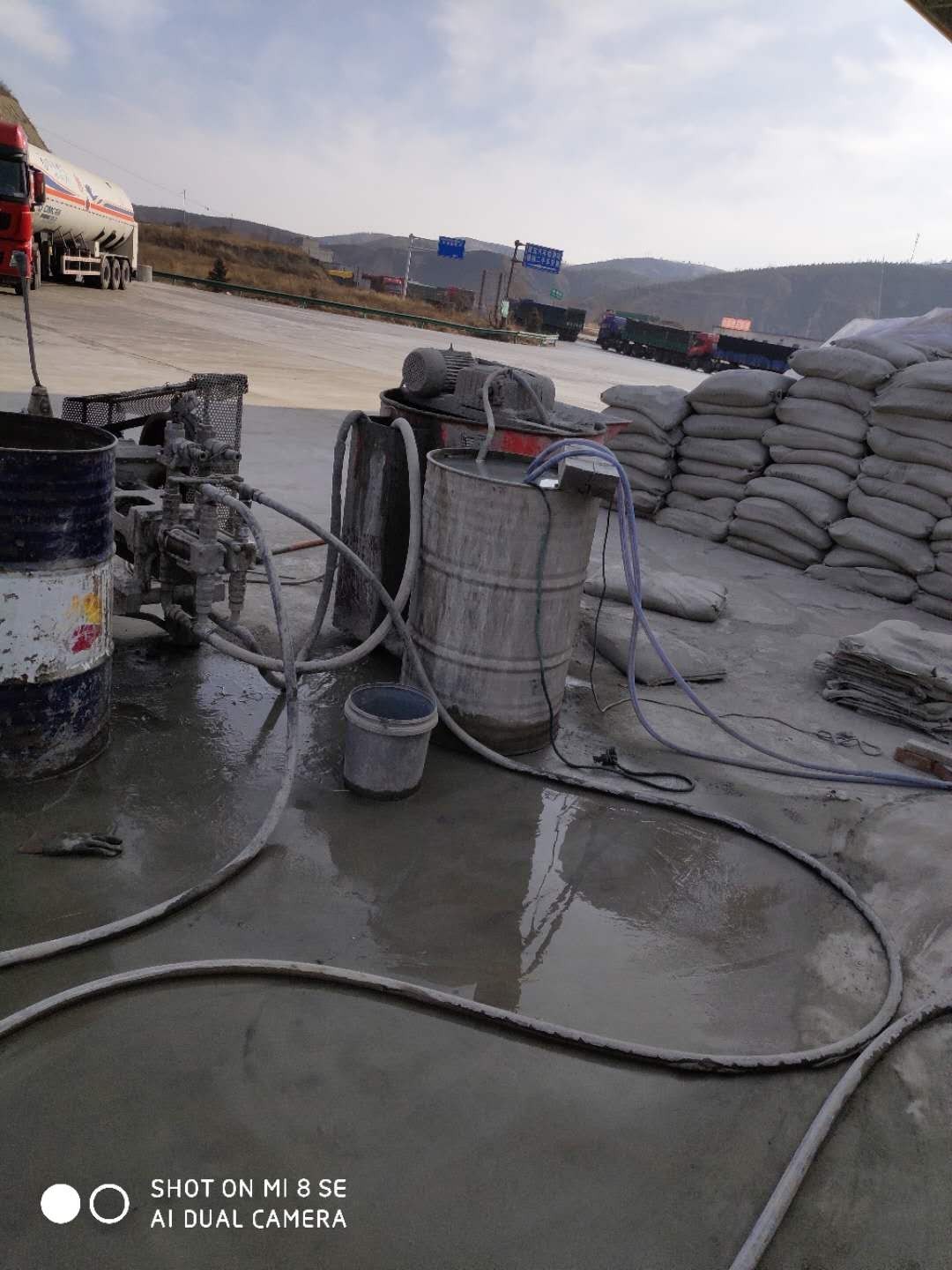 浆液需要现场拌制,并且严格控制配合比。现根据制浆机容量向内注入定量的水,然后边搅拌边加入定量的水泥,待浆液无明显沉淀后即可将水泥浆倒入储浆桶,并且需要不停地搅拌,以防止浆液沉淀离析。